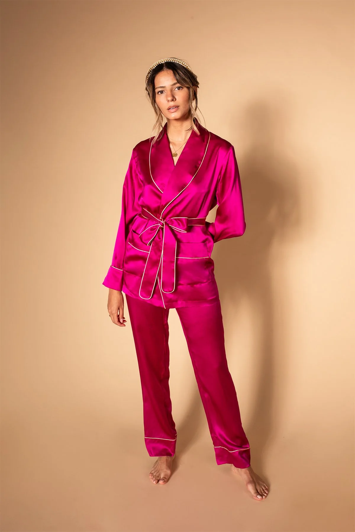 A gorgeous lady isn’t required to cover her head with a crown. A silk touch is enough for her to feel like a royal queen. This garment is crafted in a rich pigmented, flawless 19 momme silk fabric, making it the most luxurious loungewear piece you will ever own. Its wraparound belt lets you customise it to your personal preference and is just a teeny bit oversized to complement a petite to medium-large frame. The lustrous silk is shaped into shawl lapels with perfectly rolled up sleeves and contrast piped edges. The trousers are slightly oversized with a straight cut and silk piping near the bottom. L’escale is giving you a lavish gift to choose an elegant look for yourself.
