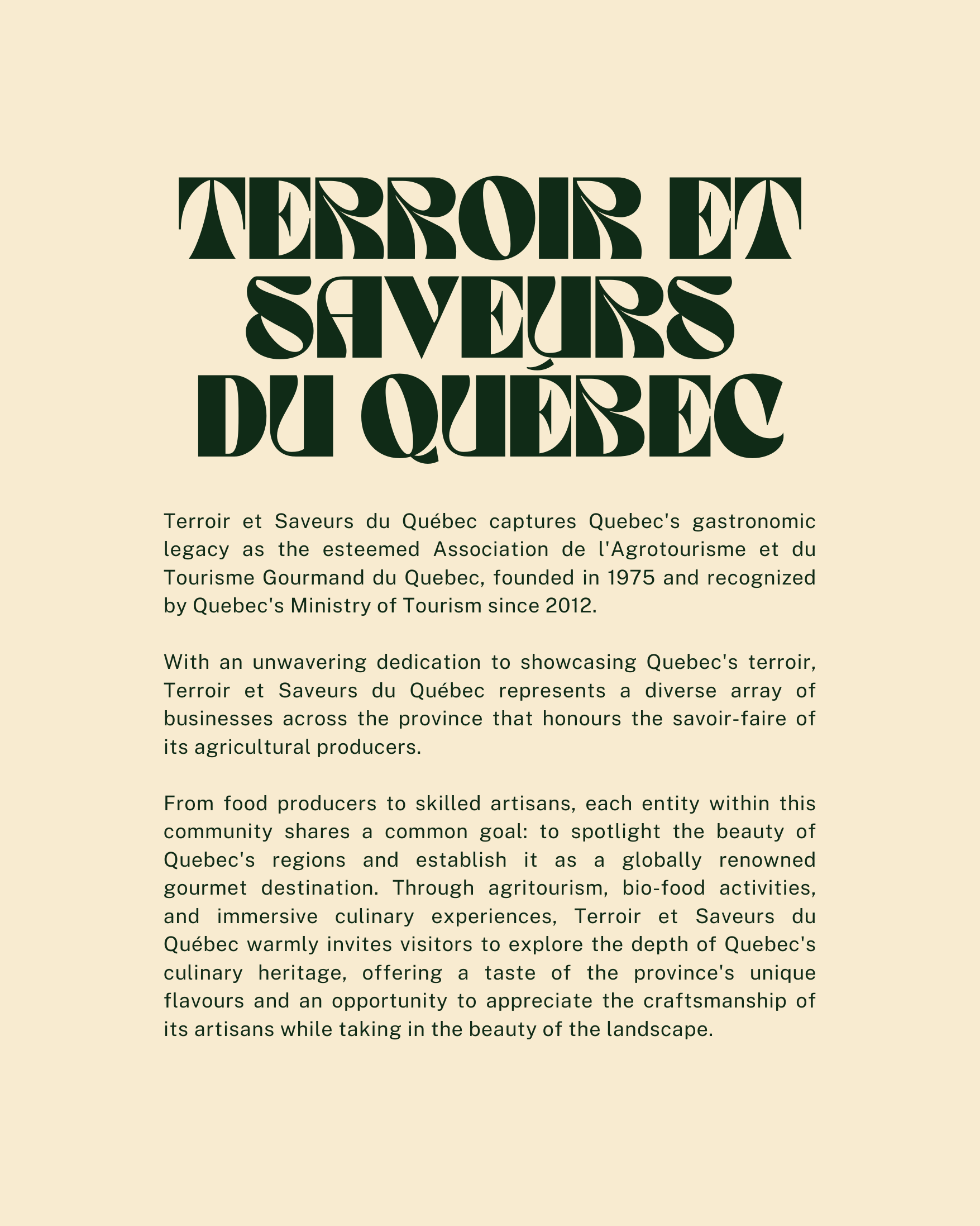 Introducing a travel guide dedicated to the beautiful province of Quebec, in collaboration with Terroir et Saveurs du Québec.Terroir et Saveurs du Québec captures Quebec's gastronomic legacy as the esteemed Association de l'Agrotourisme et du Tourisme Gourmand du Québec, founded in 1975 and recognised by Quebec's Ministry of Tourism since 2012.